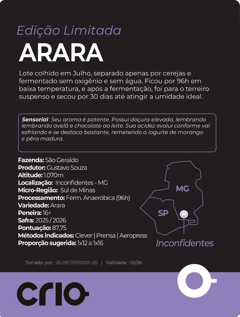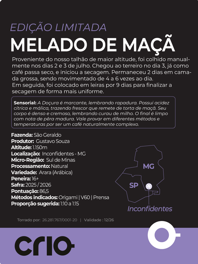 A Doçura é marcante, lembrando rapadura. Possui acidez cítrica e málica, trazendo frescor que remete de torta de maçã. Seu corpo é denso e cremoso, lembrando curau de milho. O final é limpo com nota de pêra madura. Vale provar em diferentes métodos e temperaturas por ser um café naturalmente complexo.