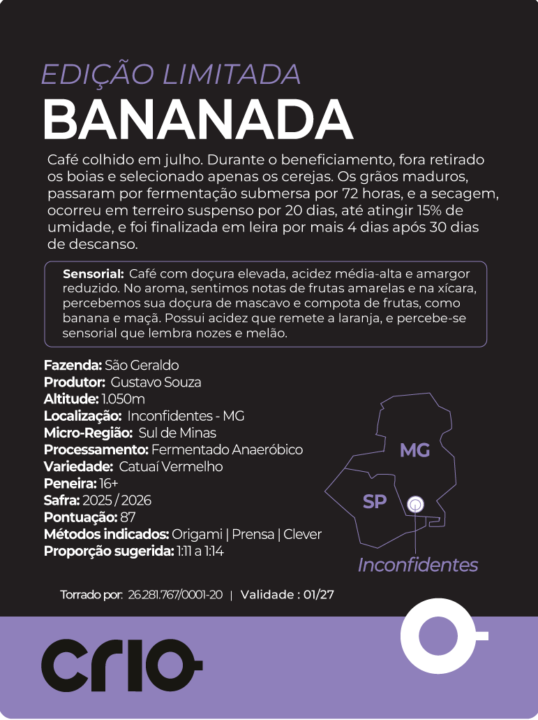 Café com doçura elevada, acidez média-alta e amargor reduzido. No aroma, sentimos notas de frutas amarelas e na xícara, percebemos sua doçura de mascavo e compota de frutas, como banana e maçã. Possui acidez que remete a laranja, e percebe-se