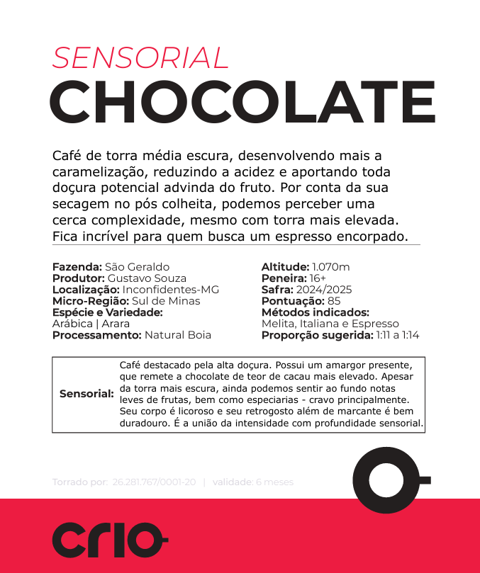Café destacado pela alta doçura. Possui um amargor presente, que remete a chocolate de teor de cacau mais elevado. Apesar da torra mais escura, ainda podemos sentir ao fundo notas leves de frutas, bem como especiarias - cravo principalmente. Seu corpo é licoroso e seu retrogosto além de marcante é bem duradouro. É a união da intensidade com profundidade sensorial.