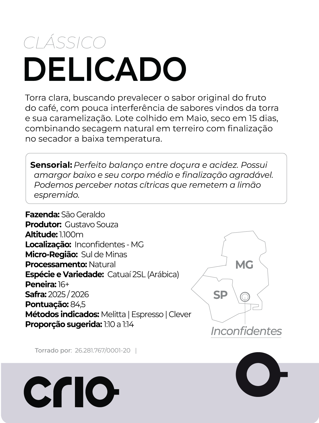 Torra clara, buscando prevalecer o sabor original do fruto do café, com pouca interferência de sabores vindos da torra e sua caramelização. Lote colhido em Maio, seco em 15 dias, combinando secagem natural em terreiro com finalização no secador a baixa temperatura.