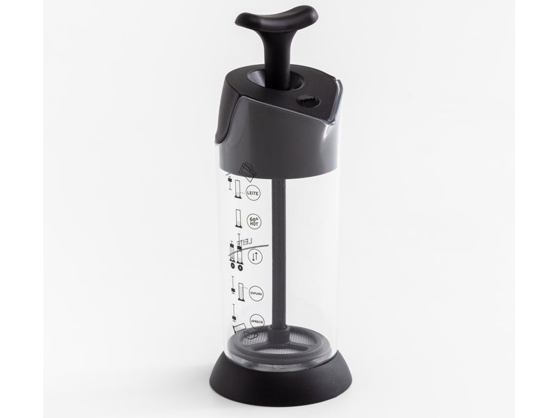 Se você é fã daquele café com leite cremoso, espumado ou aprecia drinks elaborados, os seus dias de alegria em casa chegaram. Com este acessório, é possível preparar deliciosas receitas como Lattes, Cappucinos, Mochas, Macchiatos, shakes e achocolatados de uma maneira rápida e fácil. Basta aquecer o leite, mover o êmbolo para cima e para baixo até dobrar o volume da espuma e apreciar uma bebida super cremosa.